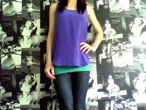 Purple Silk Tank; French Connection, Green Vest; New Look
