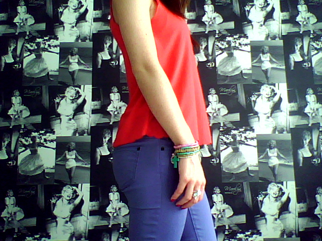 Coral Top; Topshop, Power Blue Pastel Skinny Jeans; Miss Selfridge