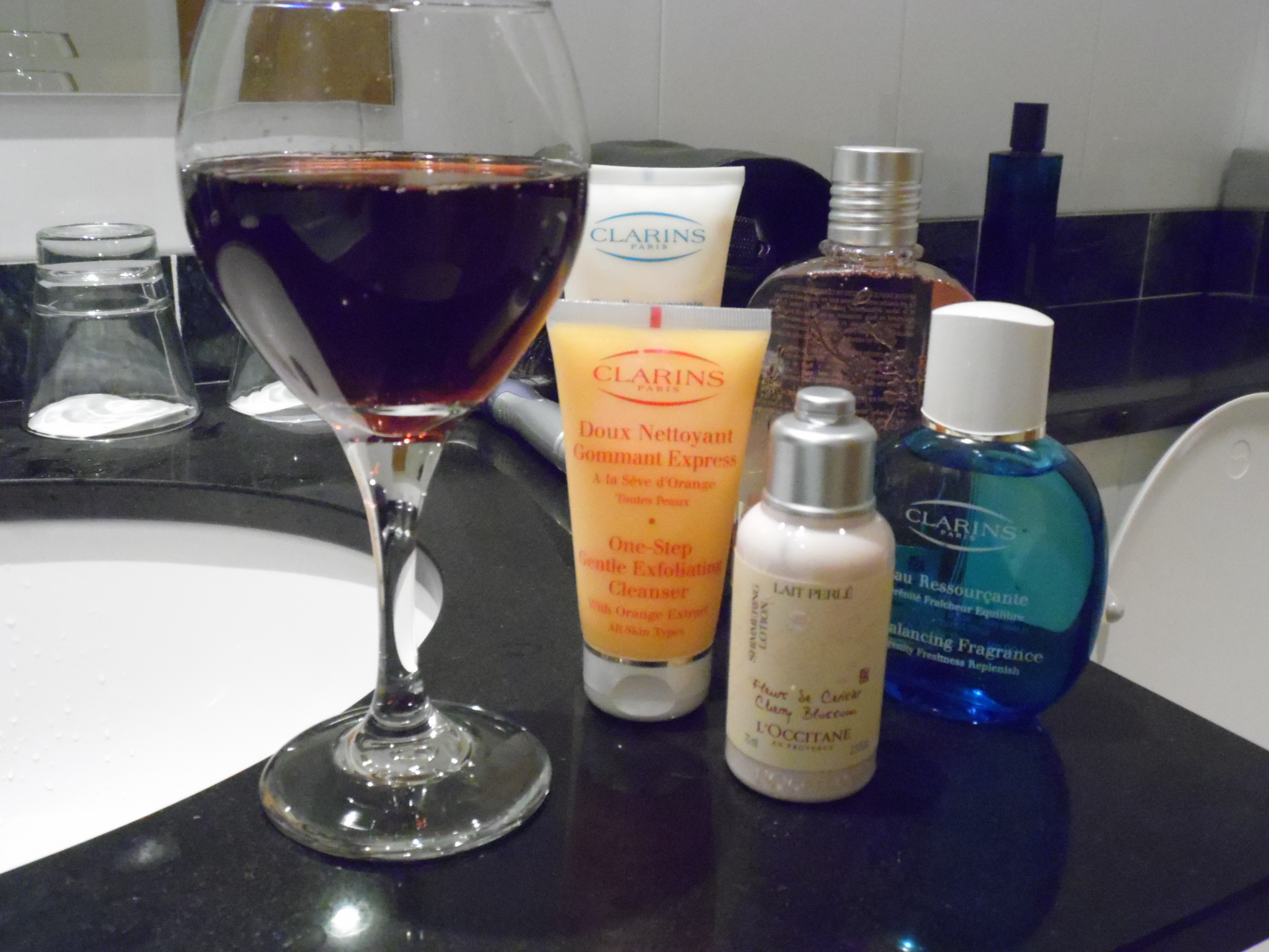 Since I was alone in the sumptuous surroundings of the Hilton I thought I would pamper myself with my Clarins & L’Occitane products. The Cherry Blossom Shower/Bath Gel made my bath smell so good! The Cherry Blossom shimmering lotion was also brilliant, it smelt divine & my skin was so soft. I used a Soap & Glory Face mask & a Gentle Exfoiliating Cleaner from Clarins.