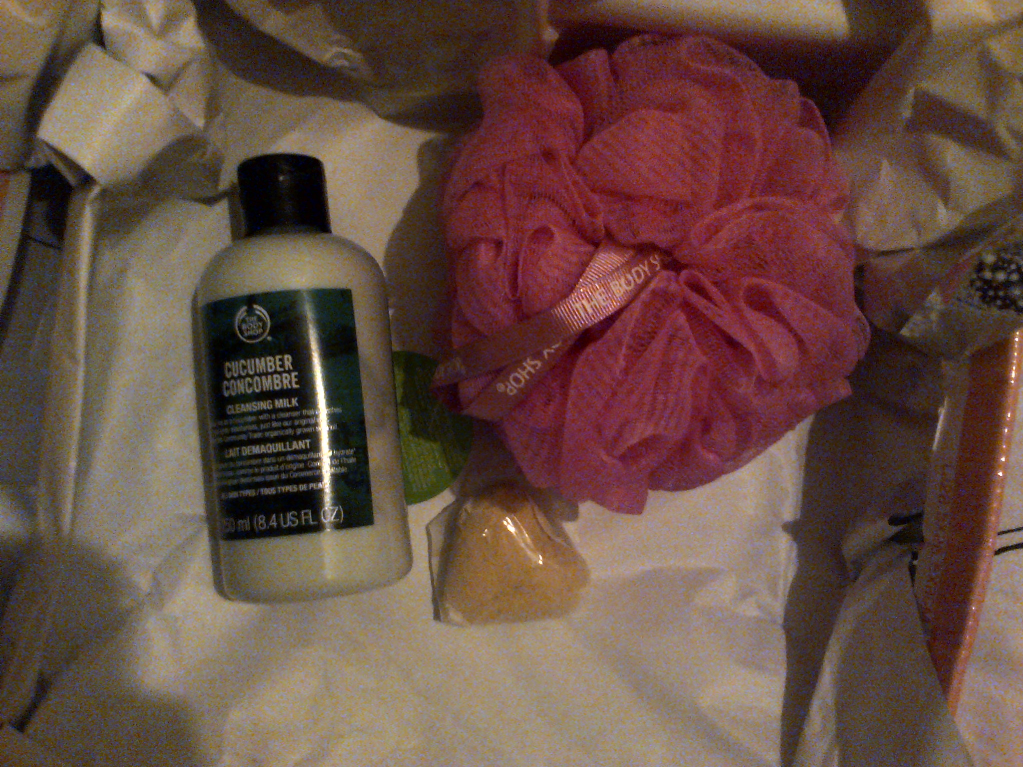 My gifts in all their glory! I received a chocolate scented soap, shower puff & cleansing milk.