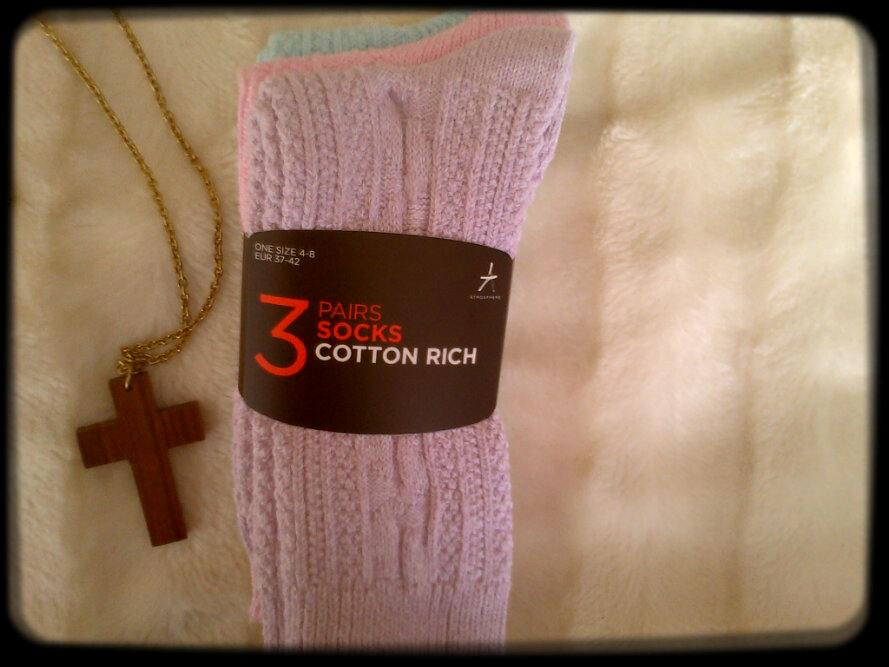I also bought some pastel colour socks, which look nice & warm & are lovely sugary colours. I also purchased a wooden cross necklace, both only £2.00 each.