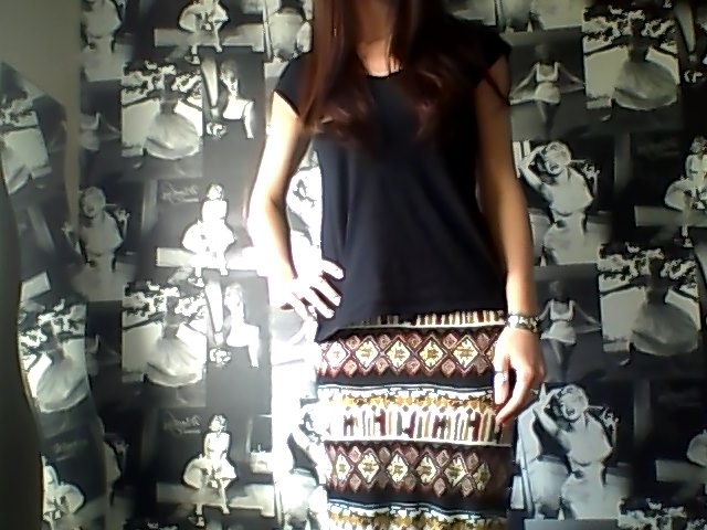 Black T-Shirt; River Island, African Print Skirt; Unbranded