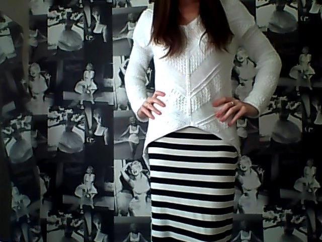 White Sweater; Miss Selfridge, Stripe Maxi Skirt; Primark