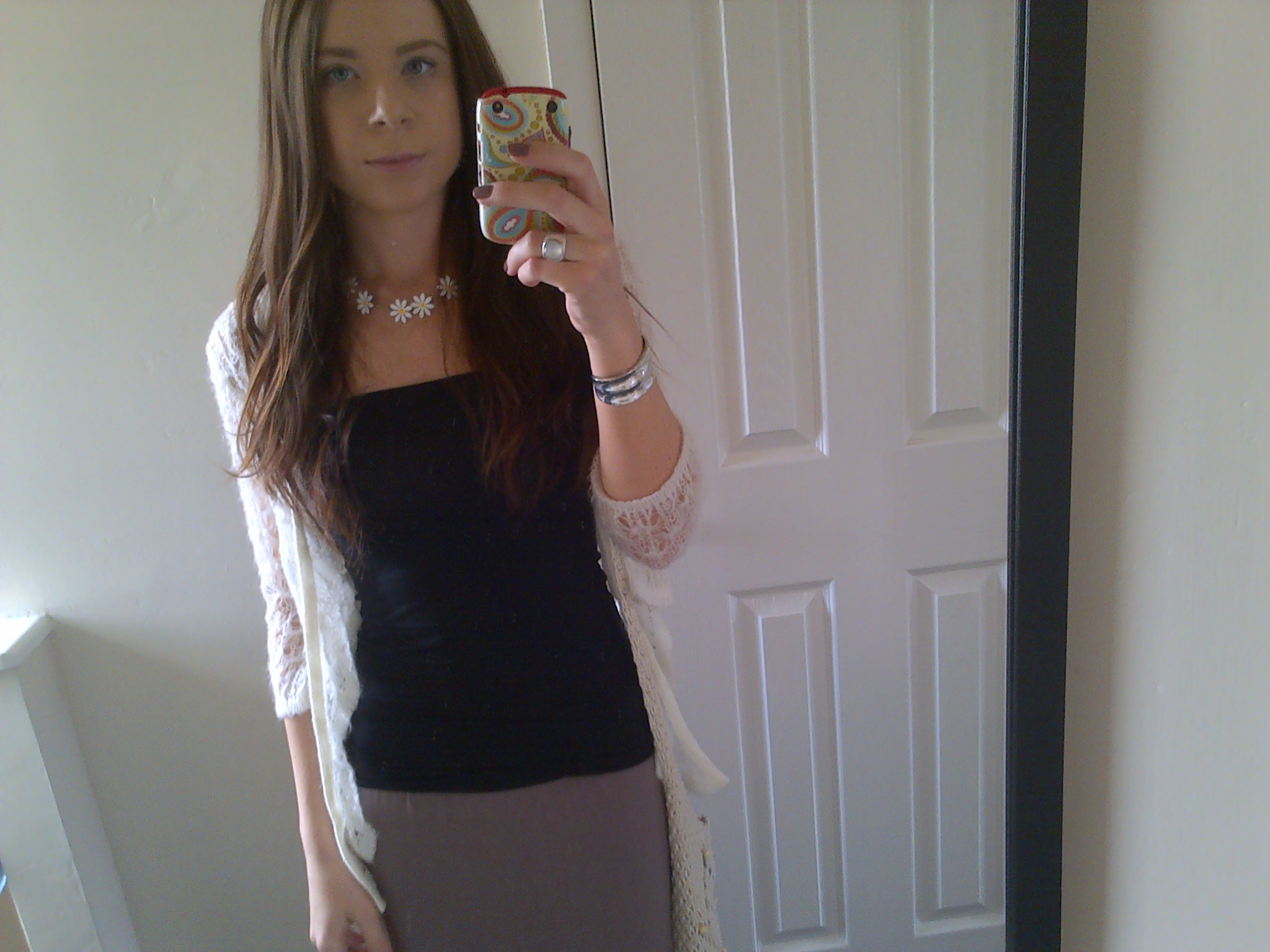 Today I wore a chic yet casual outfit. Teaming a maxi skirt with a black bandeau top. I finished my look with a beautiful cardigan I picked up at a vintage fair.