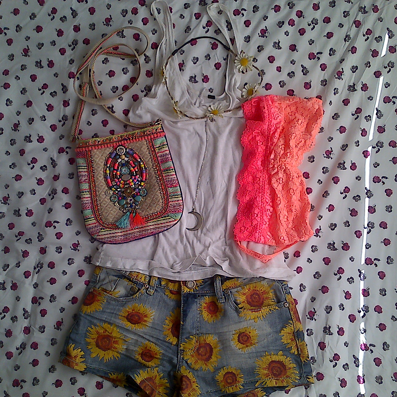 I teamed them with a simple top from Topshop, a gorgeous bag from Accessorize which will be perfect for my upcoming holiday. I finished the look with a brightly coloured bralet, daisy crown & a lovely Luna Pendant from Bohemian Dreamer.